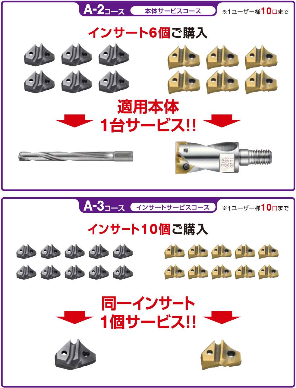 インサート2個ご購入と他社ドリル下取りで適用本体1台サービス。